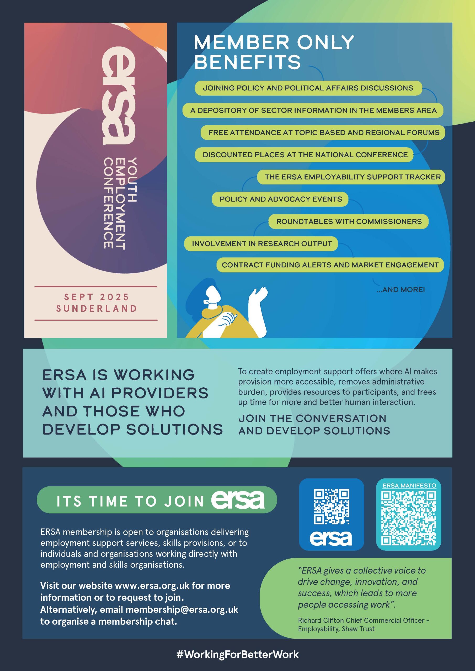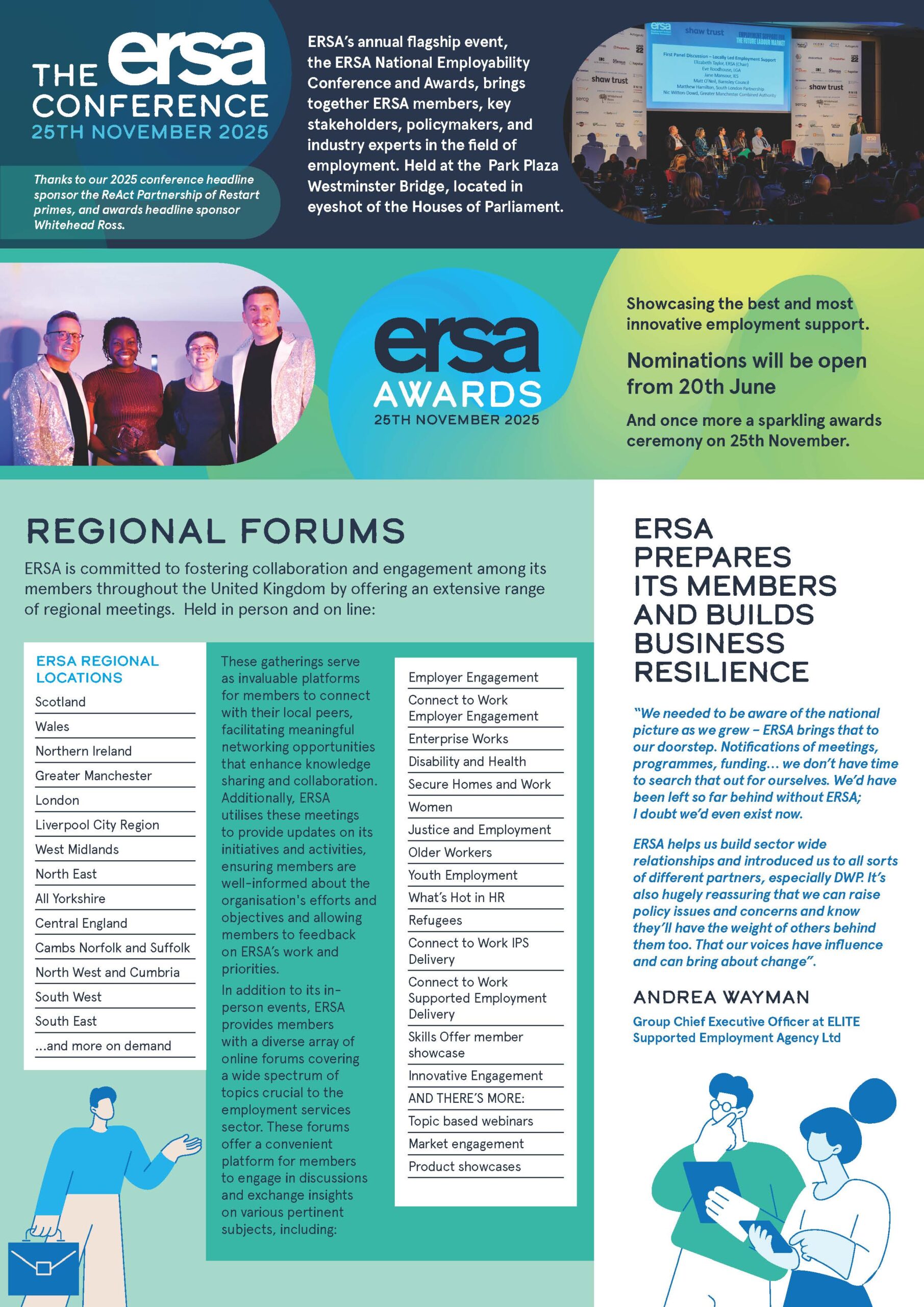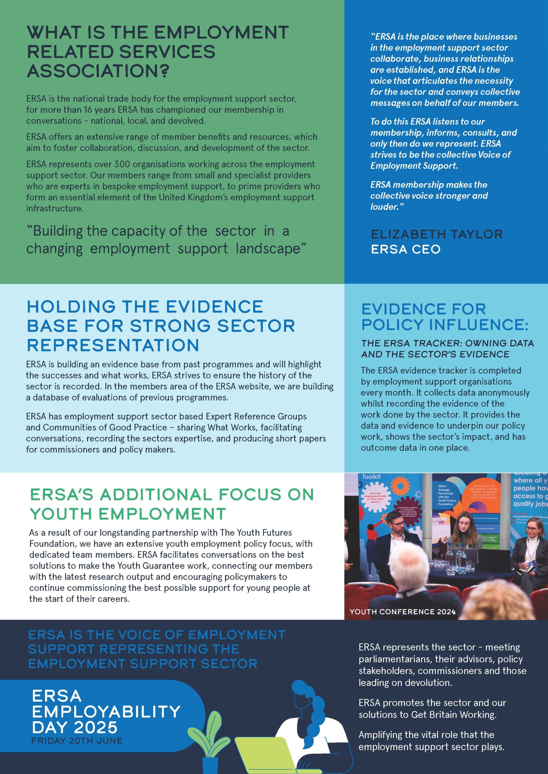 ERSA offers a diverse range of membership benefits focusing around influencing policy to improve the design and delivery of employment related services, being a useful source of information and advice and providing opportunities for providers to network with one another, encourage collaborative working and share best practice.